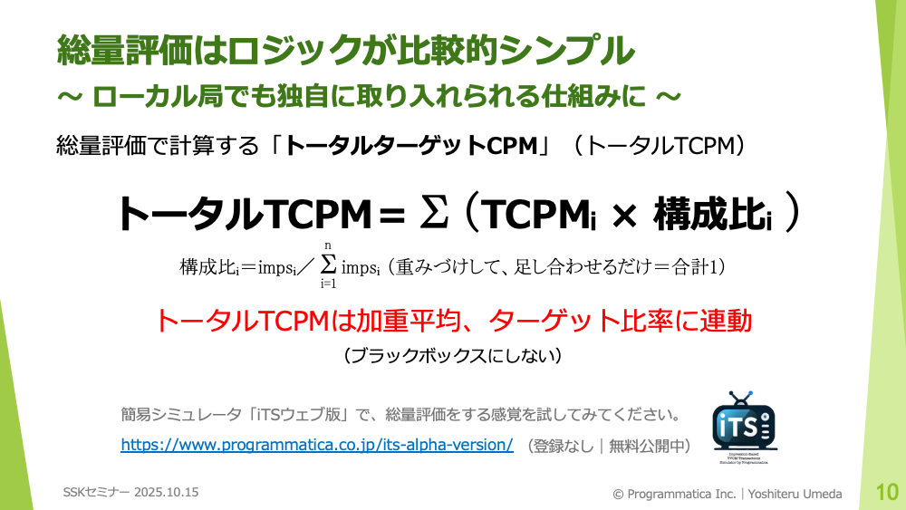 この「総量評価」は一見複雑に見えますが、ロジックは極めてシンプル です。セグメントごとのCPM(ターゲットCPMᵢ)に、構成比(impsᵢ/Σimpsᵢ)を掛け合わせ、加重平均するだけで求められます。したがって、ローカル局でも十分に独自導入が可能だと考えます。