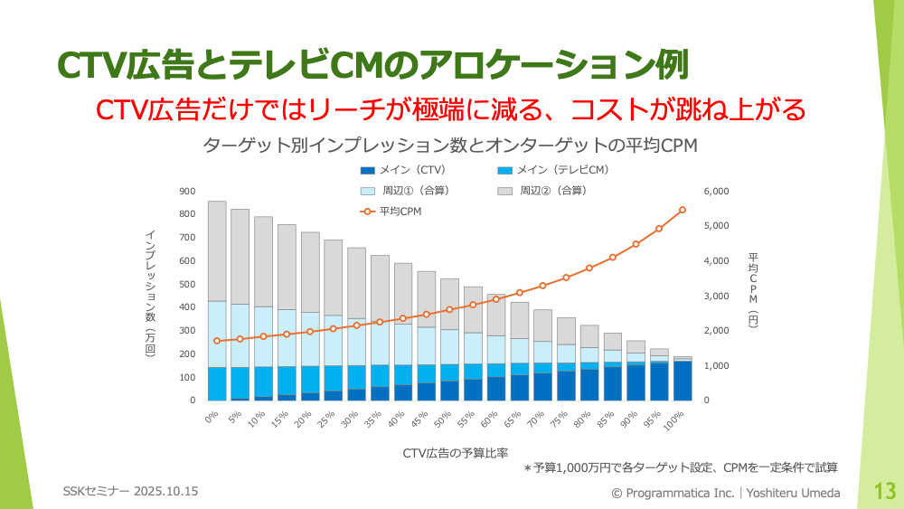 当社でシミュレーションした上記グラフで見ても(予算を5%刻みでアロケーション)、CTV広告の比率を上げすぎるとリーチは急減し、オンターゲットのCPMも跳ね上がっていきます。