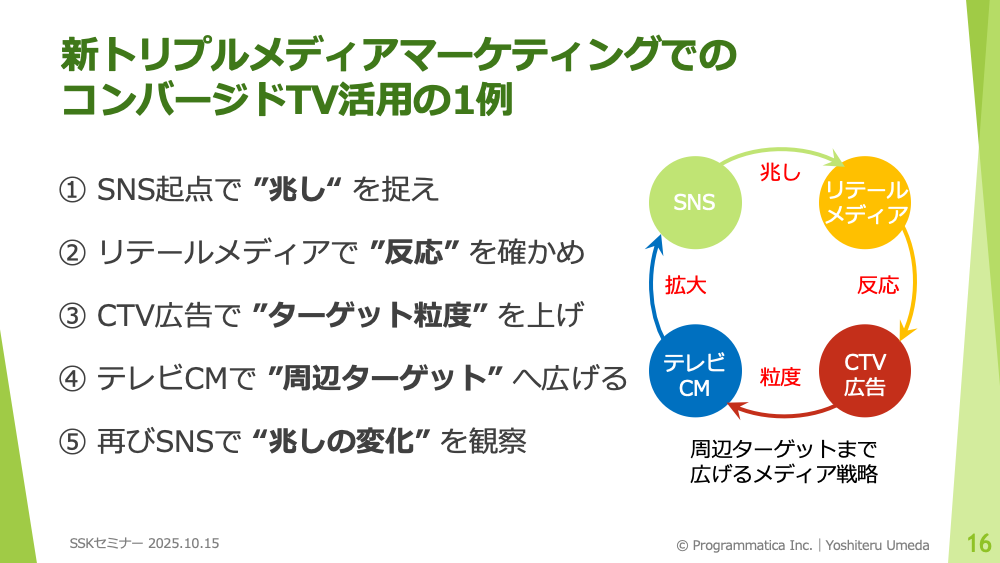 旧来のペイド/オウンド/アーンドという三分類から、SNS × リテールメディア × コンバージドTVの新たな三位一体、連携が今後重要となってくるでしょう。その活用の1例では、