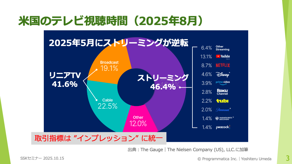 米国では今年5月、Nielsenの調査レポート「The Gauge」によると、ストリーミングの視聴時間がリニアTVを完全に逆転しました。この出来事は、単なる視聴環境の変化にとどまらず、「テレビ広告」という産業の根幹を揺さぶる構造変化を物語っています。