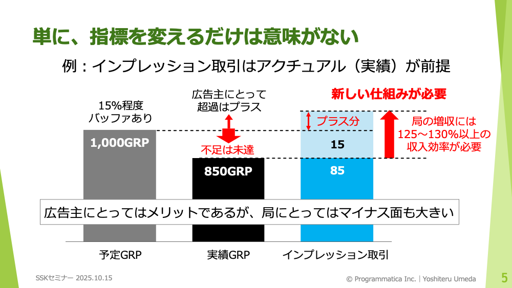 例えばインプレッション取引では、実績ベース(アクチュアル)の請求が前提になります。これは広告主にとっては透明で合理的ですが、テレビ局にとってはこれまでバッファを収益として吸収していた部分が消失することになります。マイナス面も大きいのです。