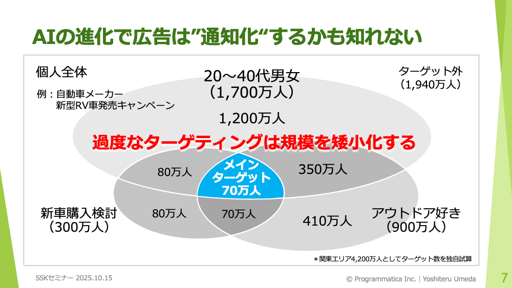また、AIの進化により 広告は"通知化"してしまうリスク もあります。つまり、過度のターゲティングはリーチの広がりを失い、大きな成果も期待できない「二重の不利」に陥り、ブランドの成長基盤を削ってしまう危険性もはらんでいるのです。
