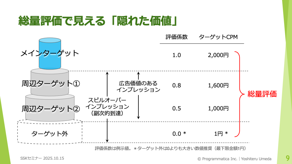 この加重平均したCPMを「トータルターゲットCPM」と呼んでいます。いわば、インプレッション評価における "積分" の結果です。これに対して、データなどに基づいて分解したターゲットごとのCPMは "微分" に相当します。