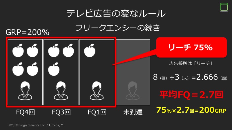 そして検算すると、リーチ75%×平均FQ約2.7回=200GRPに戻ります。