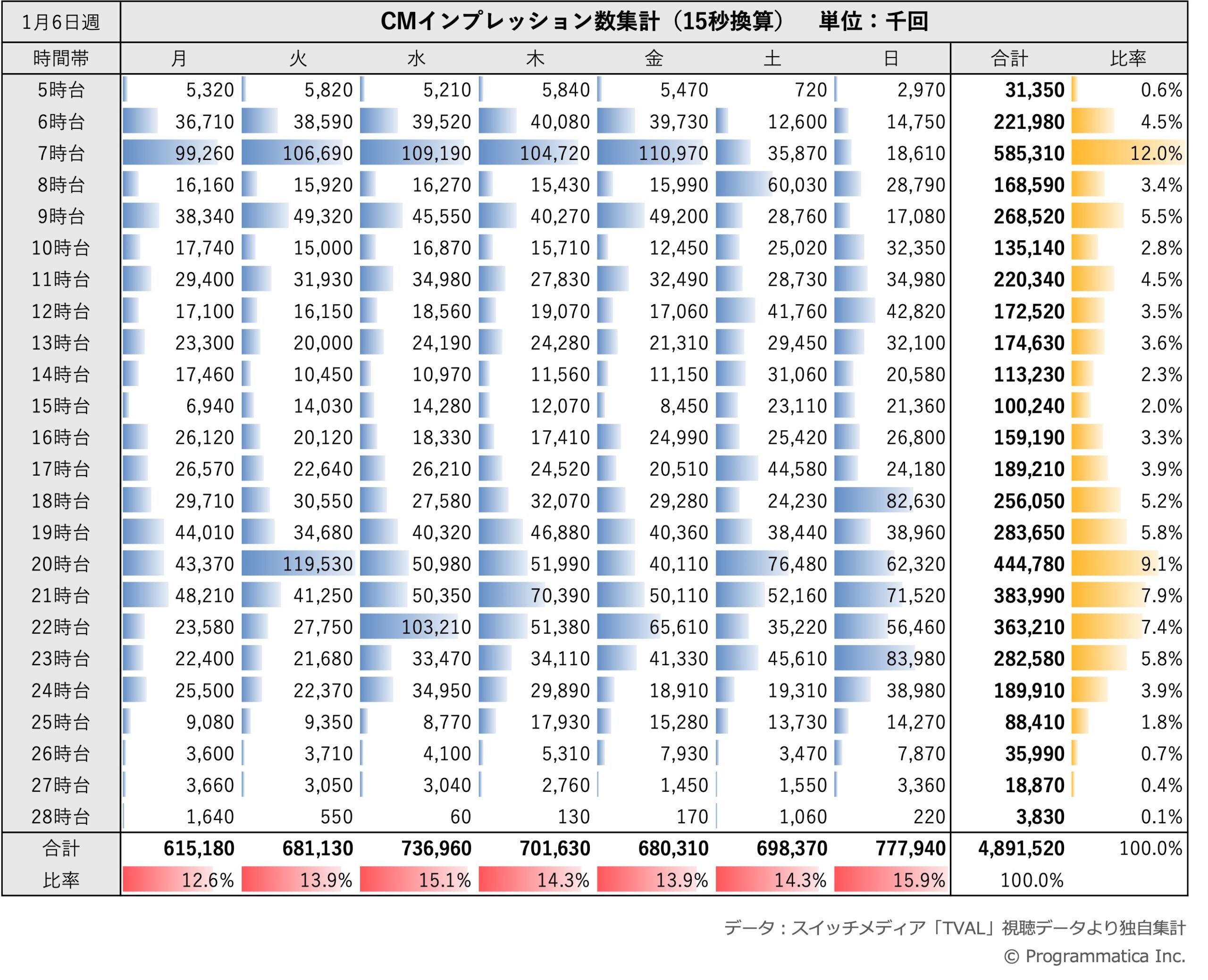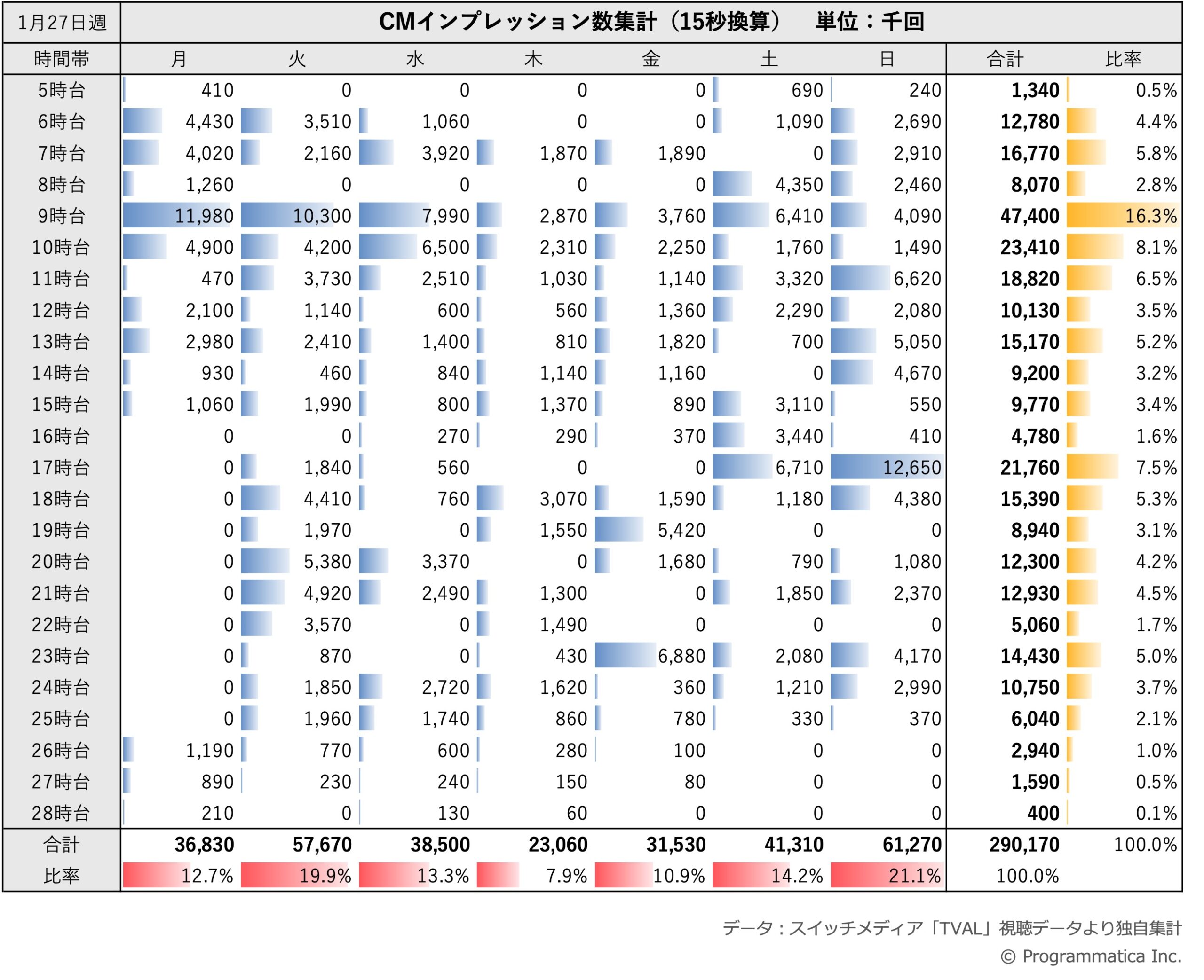 1月6日週と1月27日週の一般企業における日別・時間帯別のインプレッション数の対比を、次の表に示します。朝帯やゴールデン/プライムタイムなど、いわゆる「良い枠」のCMが大きく減少し、それが視聴者的にも、ビジネス的にも、与えた影響を大きくしたと想像します。(データバーは各週の最大値を基準に作成)*クリックで拡大